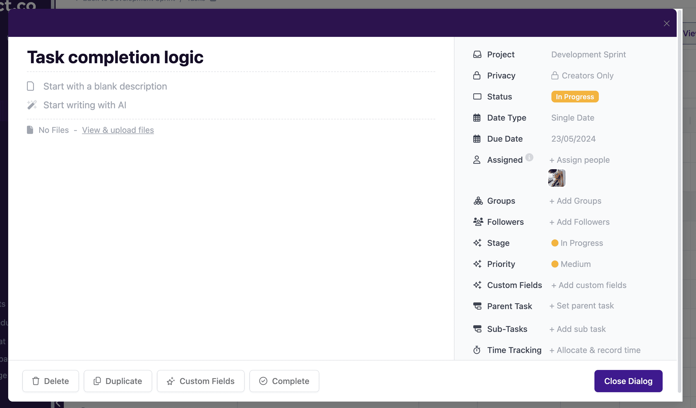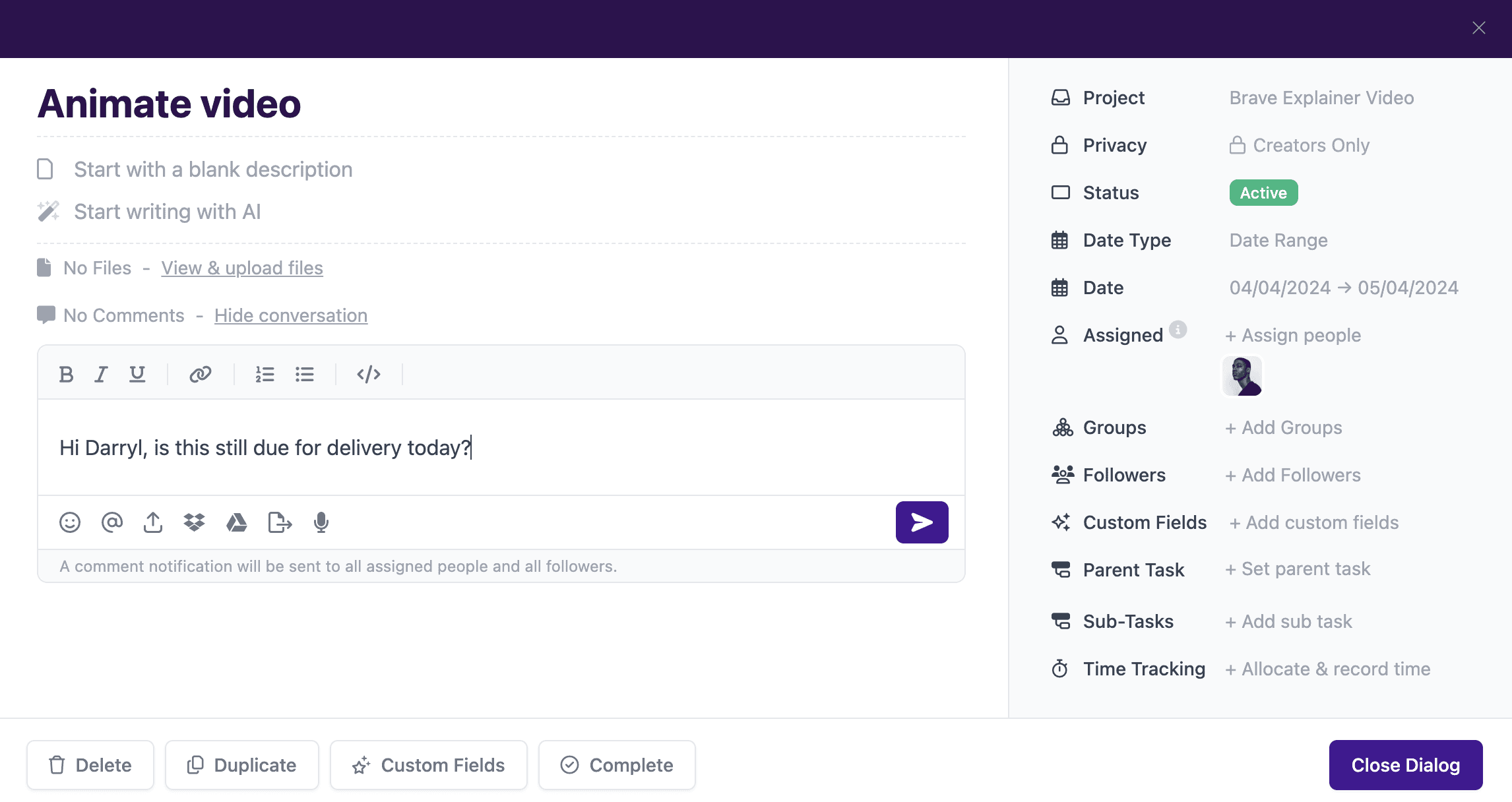 It’s quick and easy to customise tasks. You can add as much or as little detail to a task as required. You can give your task a name, add a deliverable date, assign it to a team member, give it a status, and more: