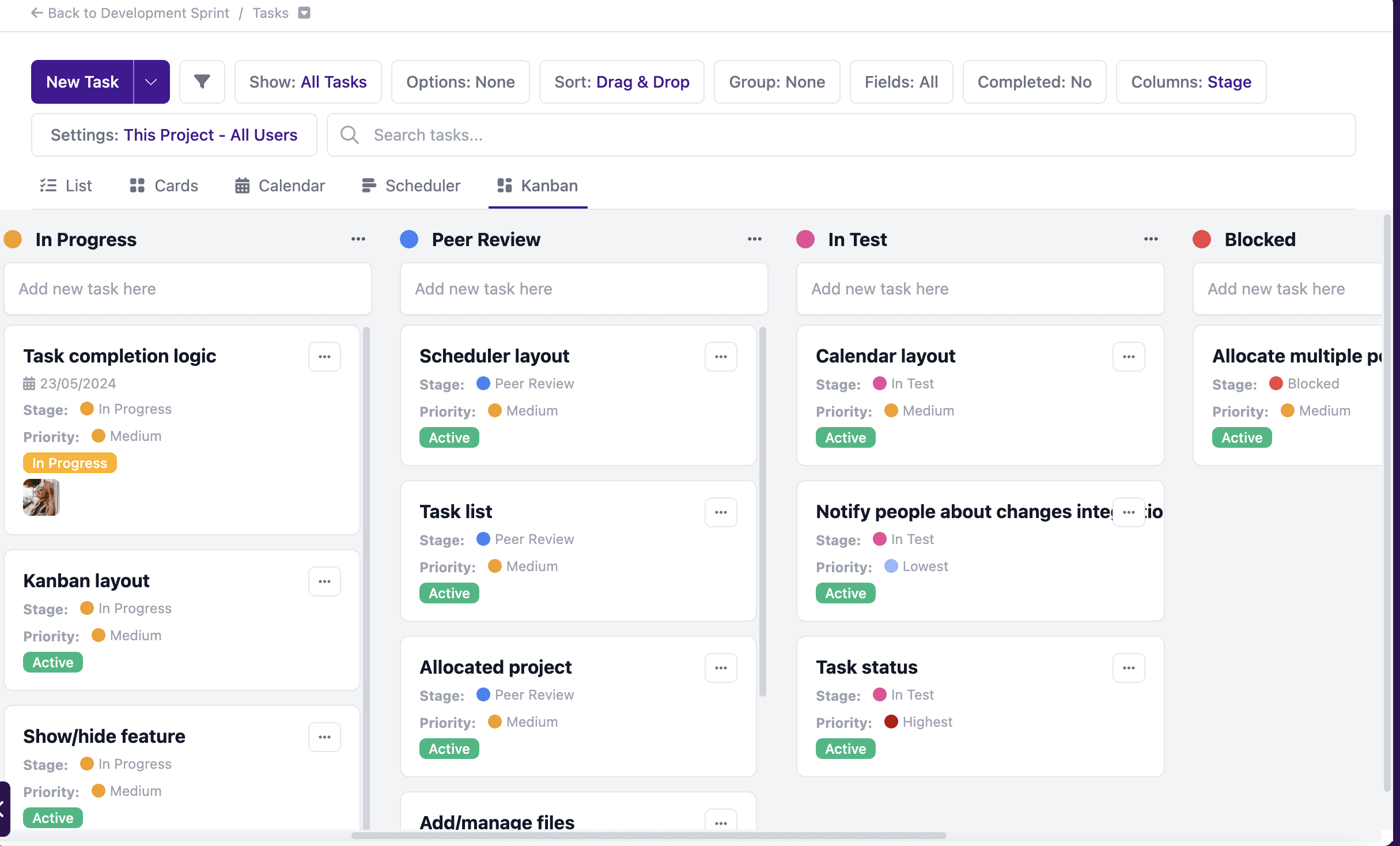 The Kanban view is a great way to visualise your tasks and move them along to the next stage in the process with a simple drag-and-drop: