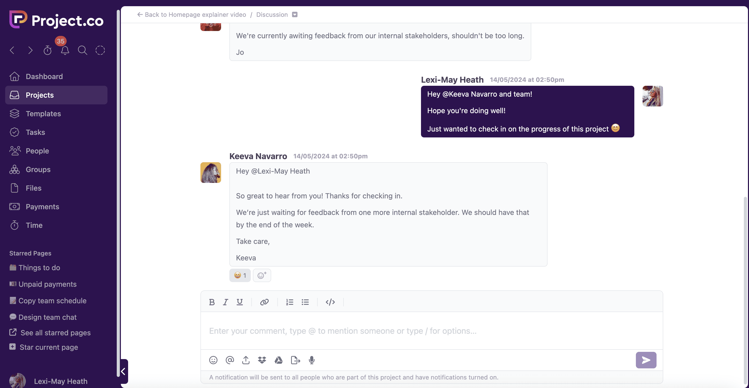 Everyone involved on a project is free to leave comments on the discussion feed. This is a chronological account of communication throughout the project – making it easy to search for previous messages: