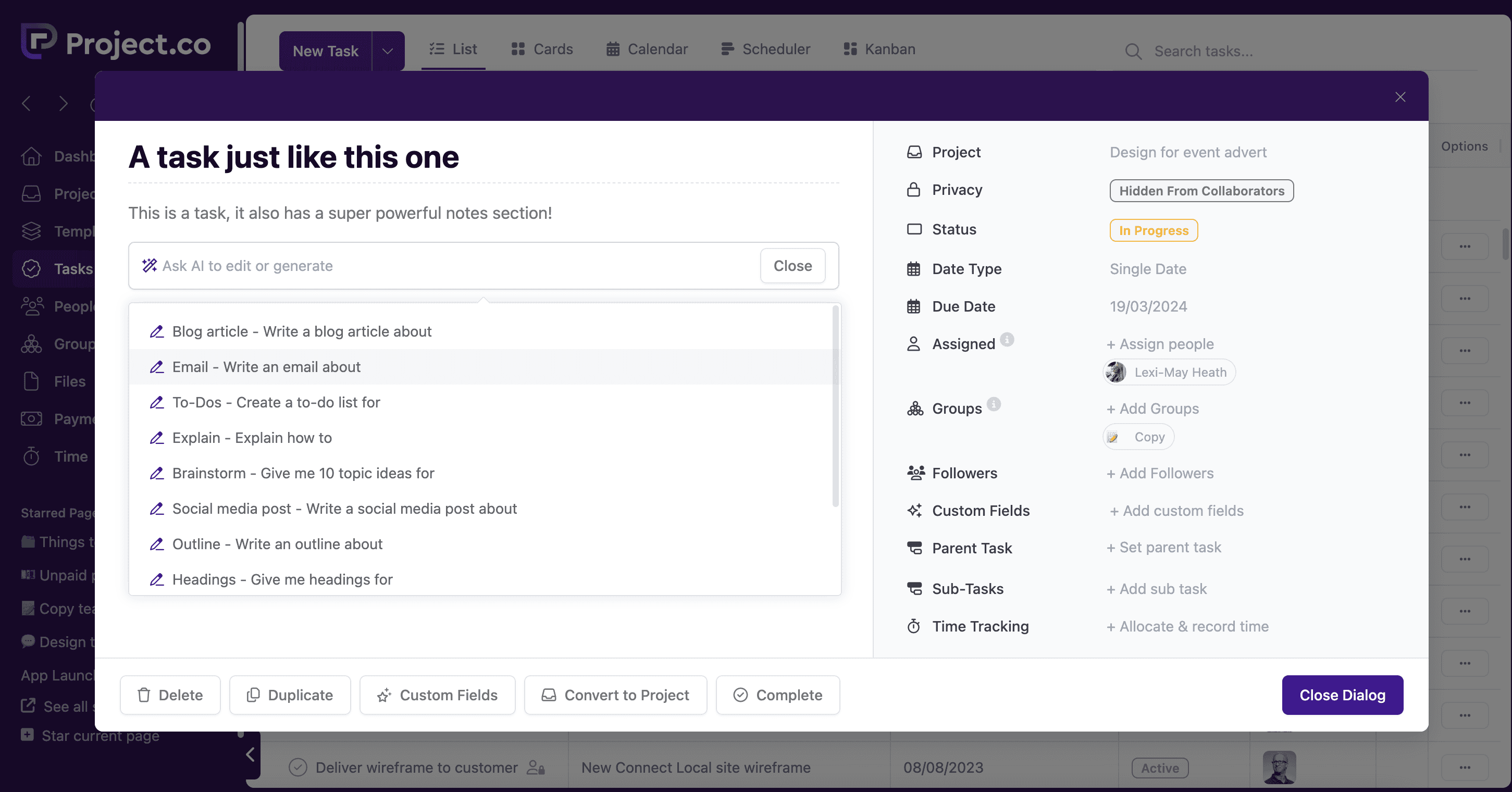 Project.co makes it easy to manage all of your team’s tasks. When you open up a project, you can assign a task to a team member, adding a timeframe, and any additional information that you think will be helpful.