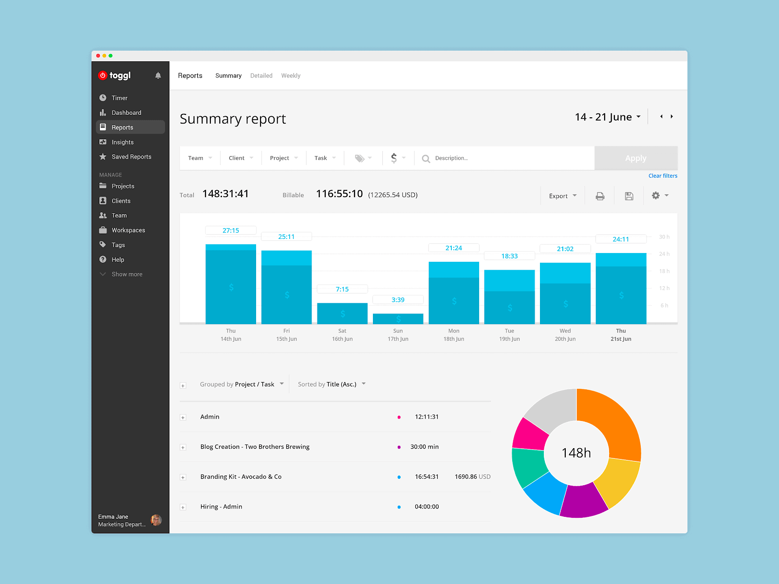 Toggl is useful if you’re managing a team as it allows you to track individual users, and you can organise time entries by team, client or project.