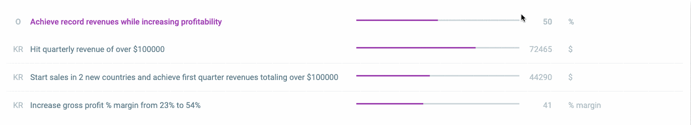 So, in the example below, we see the example of a sales objective to achieve record revenue while increasing profitability. Many companies would leave this as a goal, or put a number to it, and move on. But in the OKR model, you have to specify 3-5 key results. In this instance, we’ve got a quarterly revenue target of $100,000, sales in 2 new countries, and an increase in profit margin from 23% to 54%. Logging progress on the key results gives you a good idea (and a percentage) of how close you’ve got to achieving your overall objective.