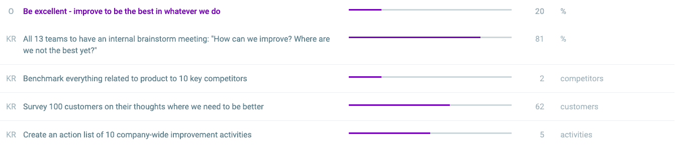 But when this is tied into the key results – a certain number of internal brainstorming meetings, competitor benchmarking against a specific number of competitors, customer surveys, and an action list of 10 company-wide improvement activities – you can see that, suddenly, this all becomes very tangible, and a blueprint for achieving pretty vague and ambitious goals.