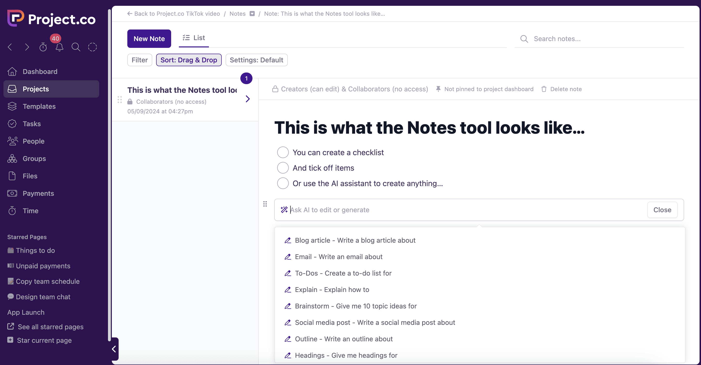 We also use Project.co’s ‘Files,’ ‘Notes’ and ‘Embeds’ functionality to make sure that on any given project or task, our team is able to access and share important notes…