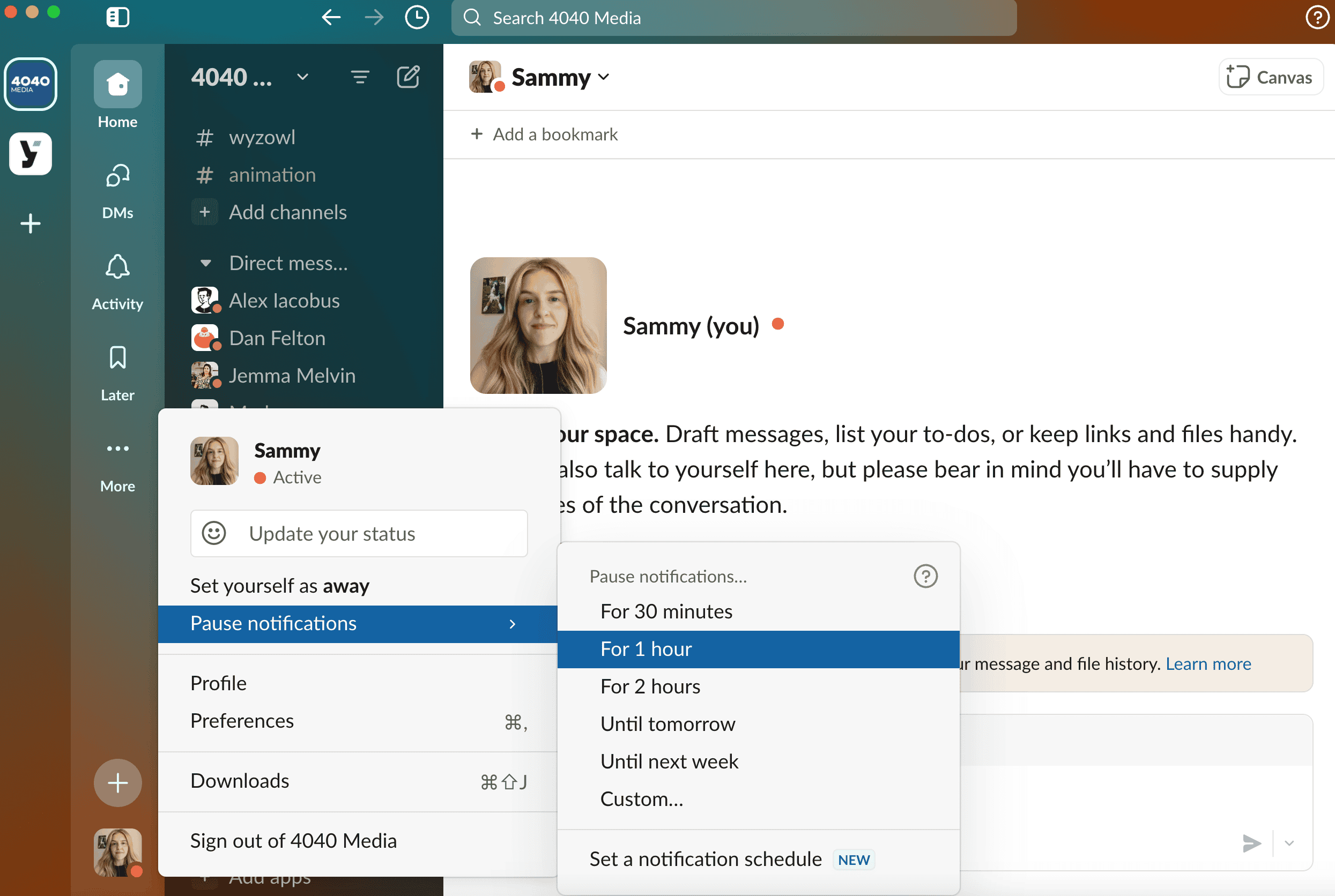 If your company uses Slack, it’s easy to put your notifications on snooze if you want to get stuck into an important project. Just click on your profile icon and select how long you want to pause your notifications for: