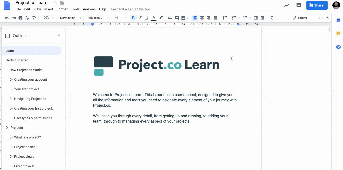 The centrepiece of this approach is what we’ve called Project.co Learn. This is a comprehensive, 16,000+ word guide – an end-to-end manual that lays out everything about how to get up and running and achieve success using Project.co.