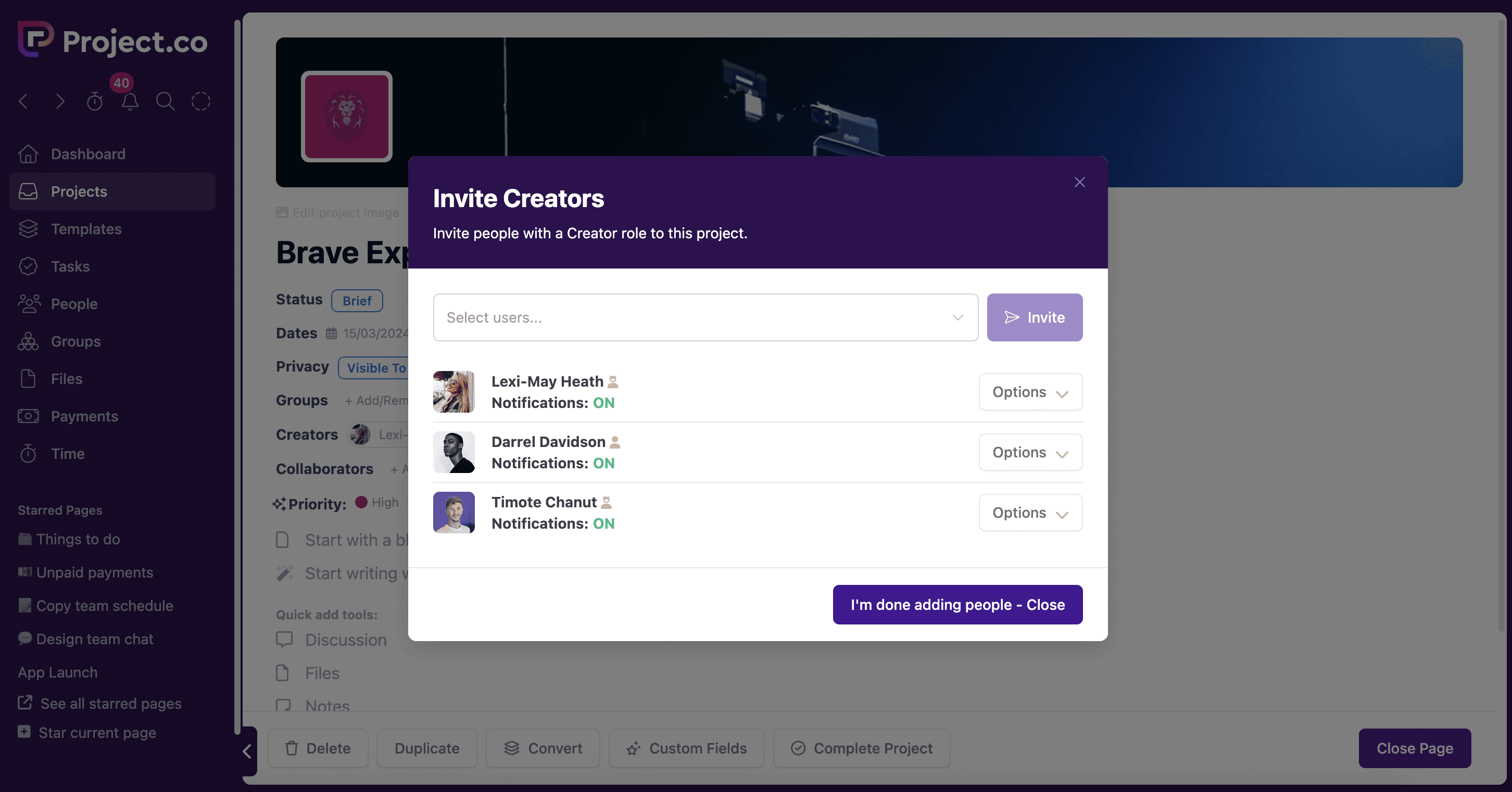 This includes people from your team, the client-side, and even freelancers. Plus, you can set different permissions for different groups, so you only share the most relevant information.
