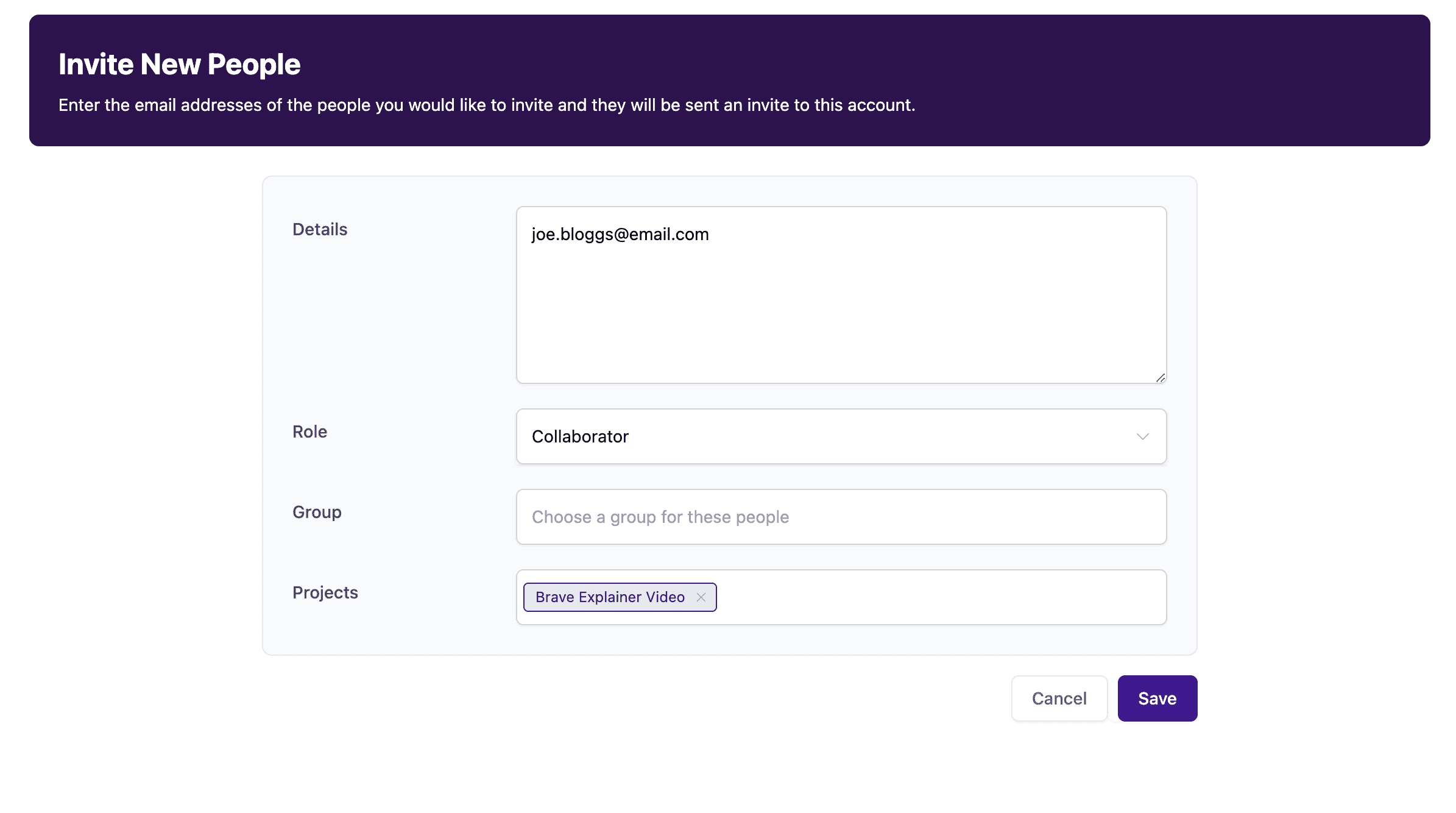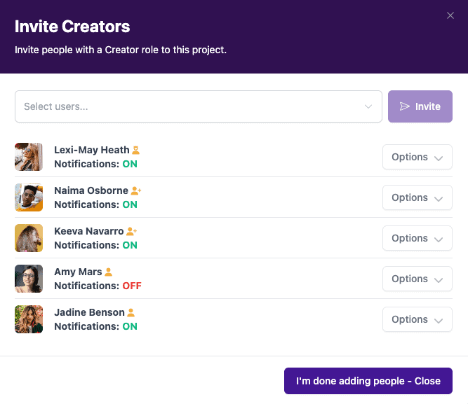 Enter in the person’s email address and select their role. We have the ‘collaborator’ role for clients and the ‘creator’ role for your internal team. This is important because the role determines what permissions the user will have.