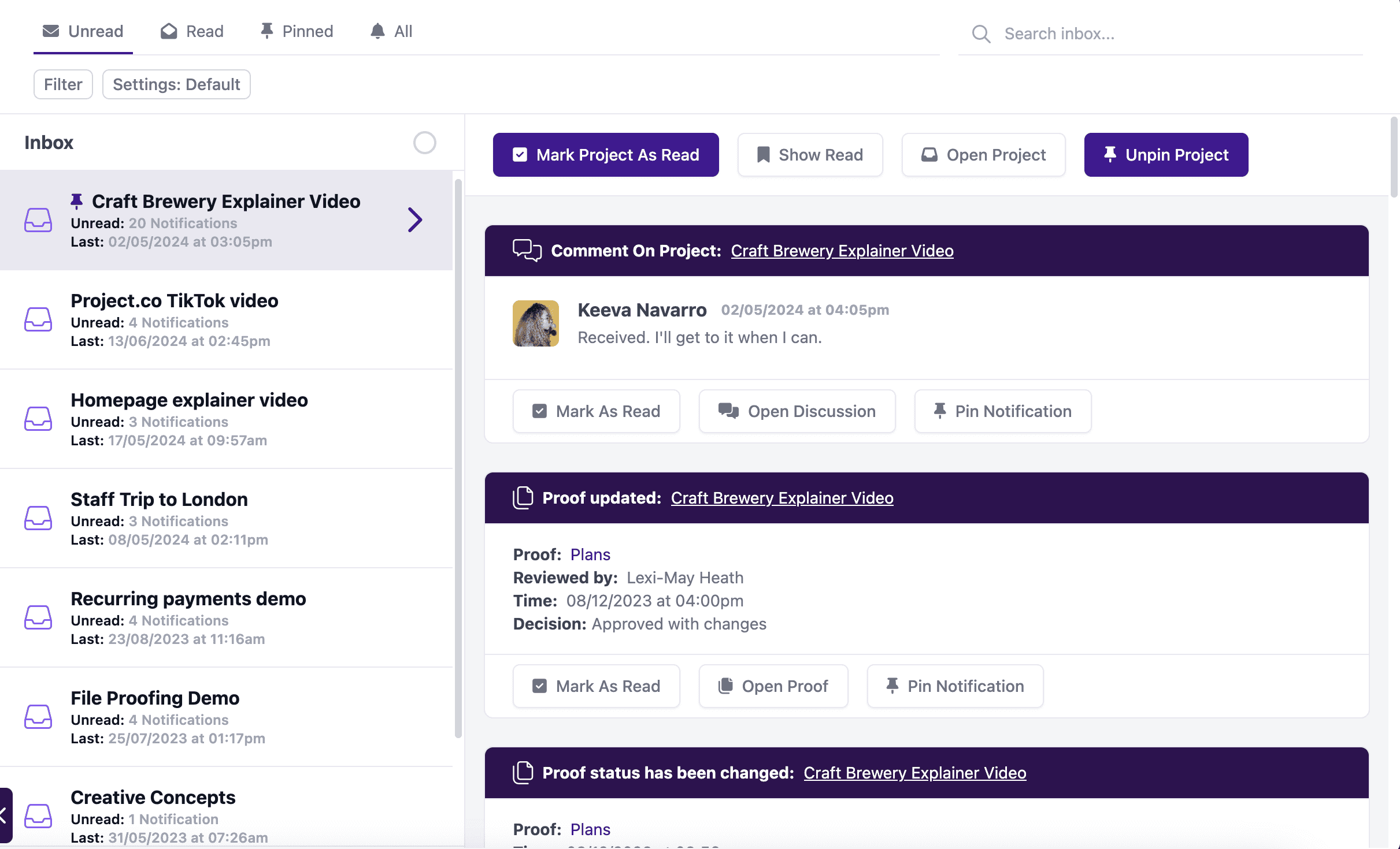 All notifications are project-specific to ensure this page never feels overwhelming, and you can easily mark messages as read directly from your inbox, pin projects to remind you to reply later, or open the discussion to send an immediate response.