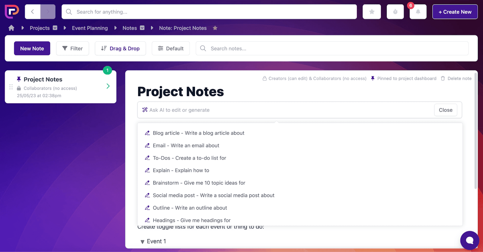 Project.co users can access their very own AI assistant from directly within the Notes feature. All you need to do is enter a forward slash (/) and choose AI assistant from the menu: