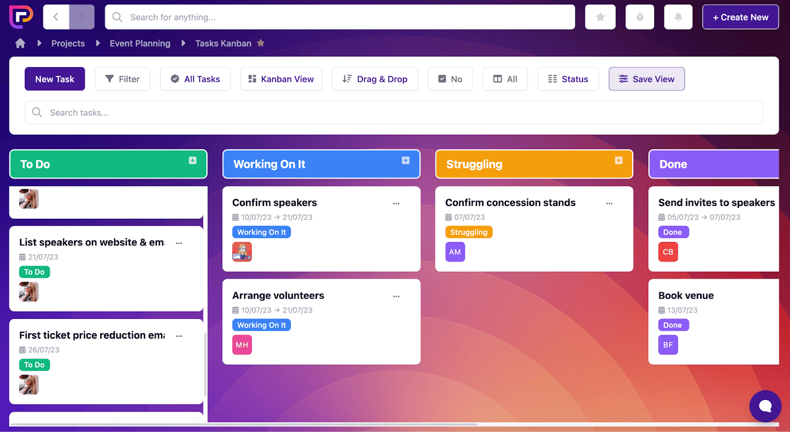 The Project.co tasks feature is a great tool for this, and our free events planning template actually comes pre-populated with customisable tasks – such as “Book Venue” and “Arrange Volunteers” – making it even easier to get started!