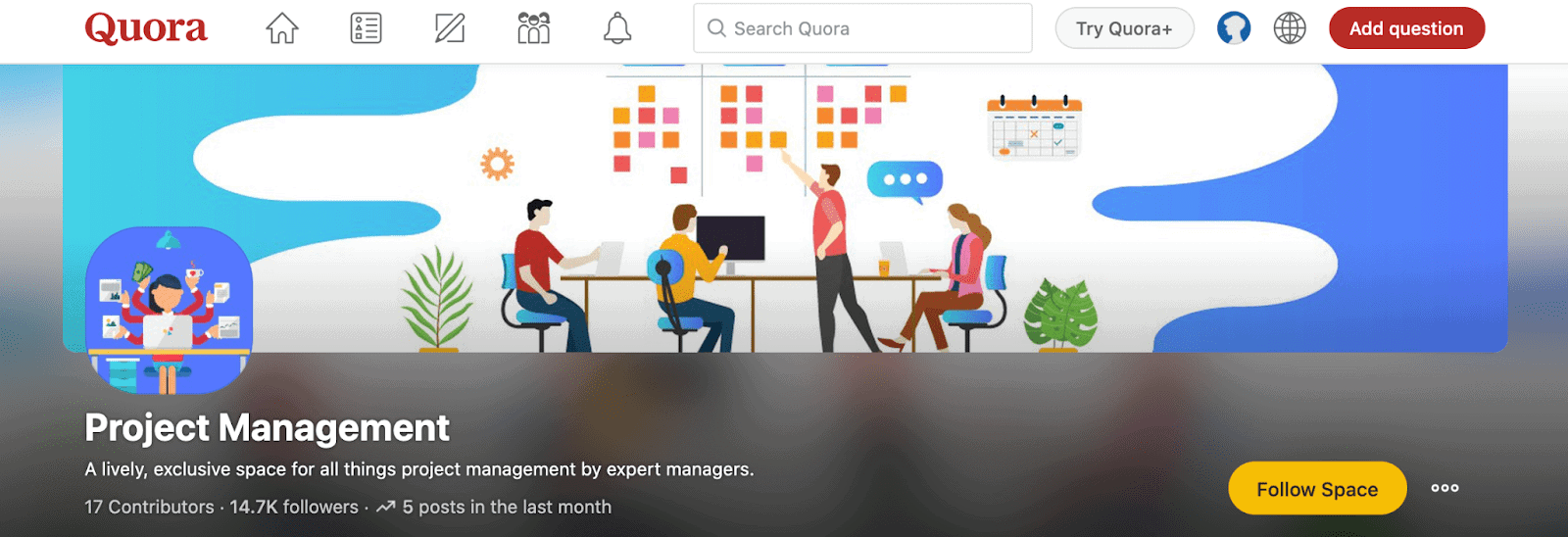 You can follow specific ‘professional spaces’, such as SEO And Digital Marketing or All About Business, and either post a question or answer someone else’s to create some useful engagement. Having found some useful contributors to follow, you can then try messaging them to extend the conversation beyond the realms of Quora and forge some useful professional relationships.